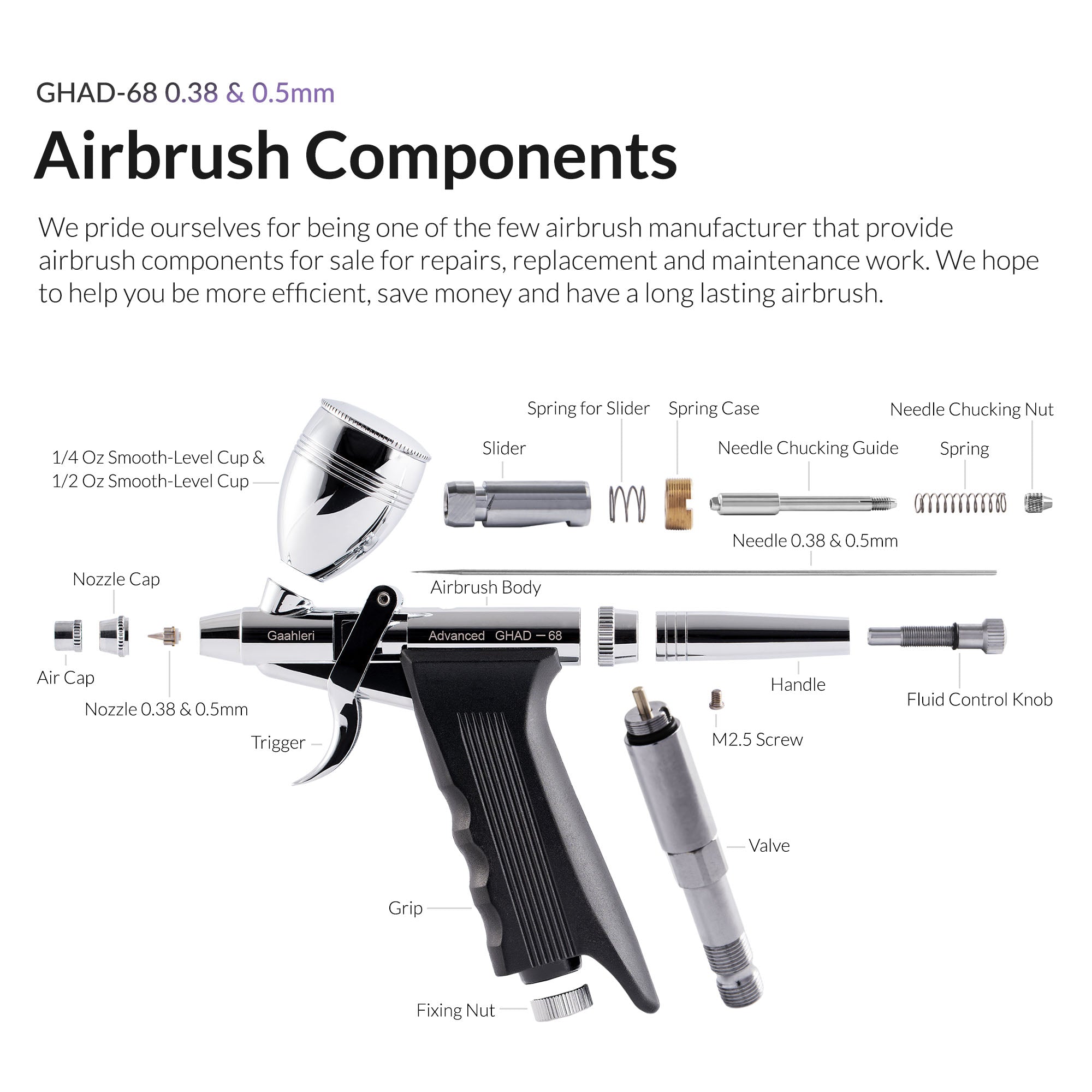 Versatile Usage: Whether you need fine arts detail with the 0.38mm needle or broader coverage with the 0.5mm option, the GHAD-68 adapts effortlessly to your airbrushing needs.