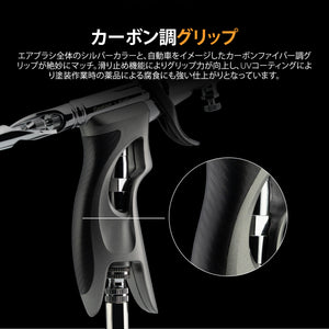 The all silver aesthetic of the airbrush pairs perfectly with the auto inspired carbon fiber-like grip. It’s anti-slip feature improves grip, and UV coated to withstand any chemical corrosion from airbrushing.