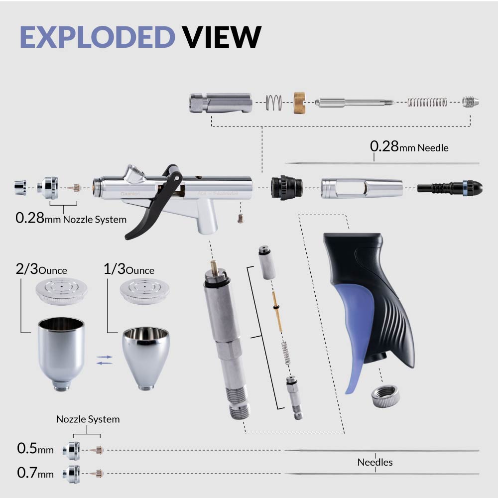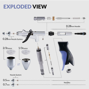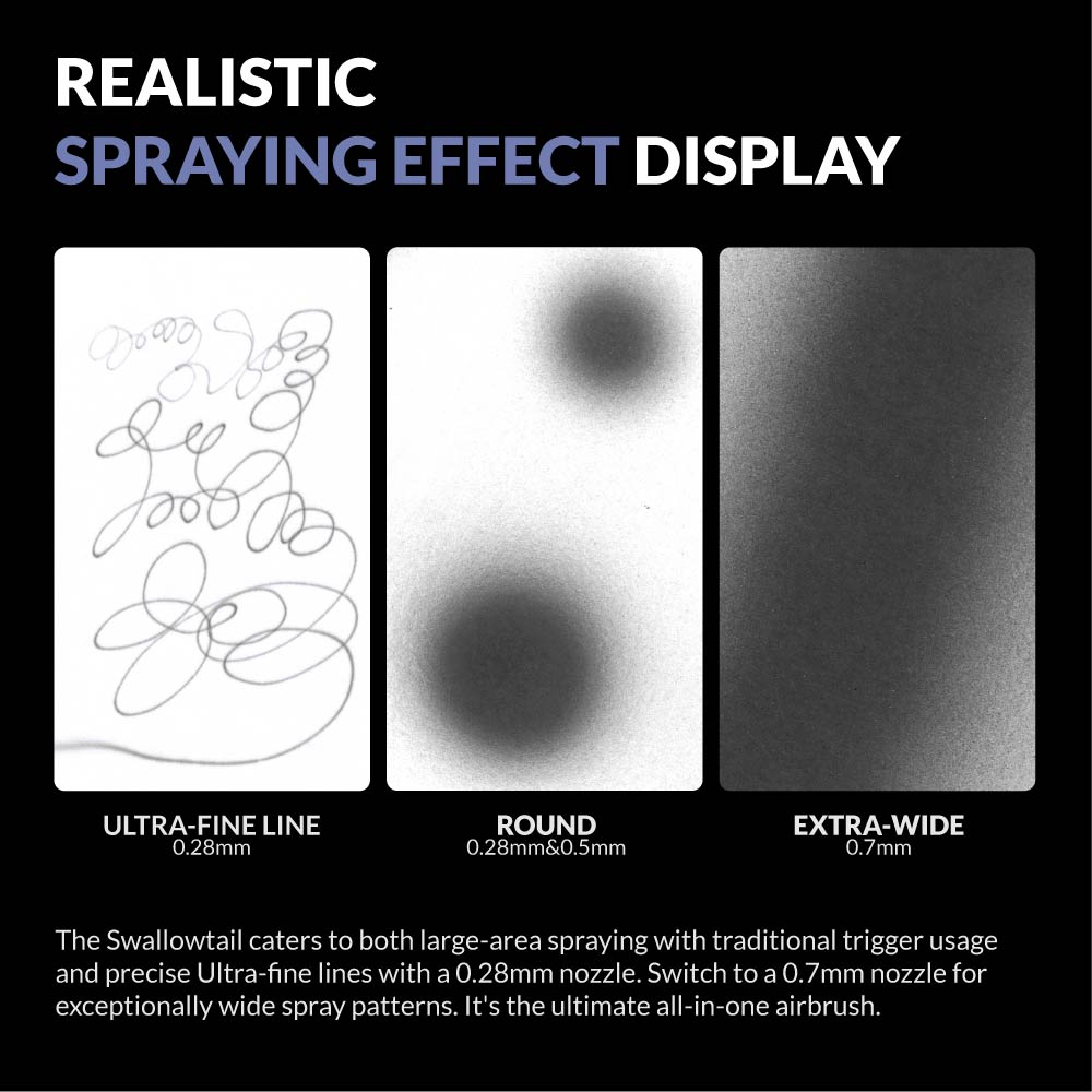 The handle is specifically designed to provide maximum comfort for all hand sizes for long airbrushing hours. The extended tail allows your pinky to rest while making micro movements to improve precision.