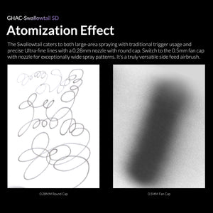 Equipped with both 0.28mm and 0.5mm nozzles, the Swallowtail is perfect for diverse applications. The 0.28mm nozzle delivers exceptional detail for fine artistry, while the 0.5mm nozzle with fan cap ensures quick, smooth coverage for large-area spraying.