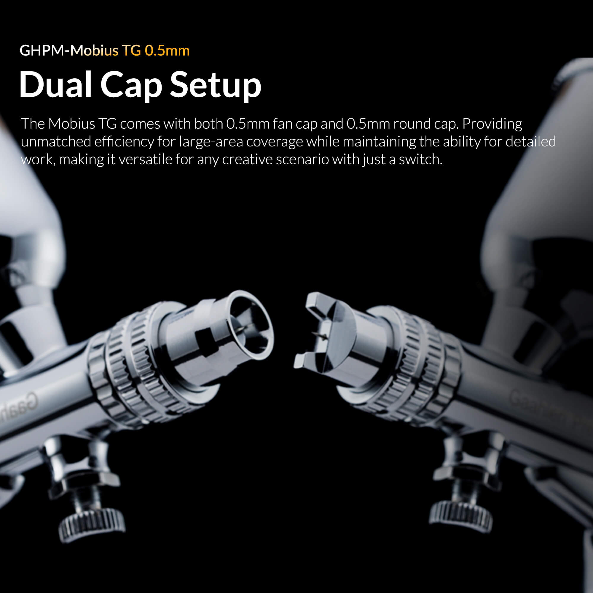 Comes with both a 0.5mm fan cap and a 0.5mm round cap. Seamlessly transition from wide-area coverage to detailed work with just a switch.