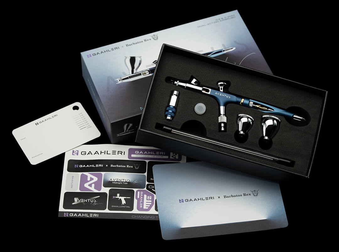 Collaboration airbrush with renowned YouTuber Barbatos Rex. Featuring a unique, stunning design and enhanced performance, this airbrush combines precision, control, and style for ultimate creativity. Comes with exclusive Barbatos Rex stickers and limited edition female quick disconnect adapter!