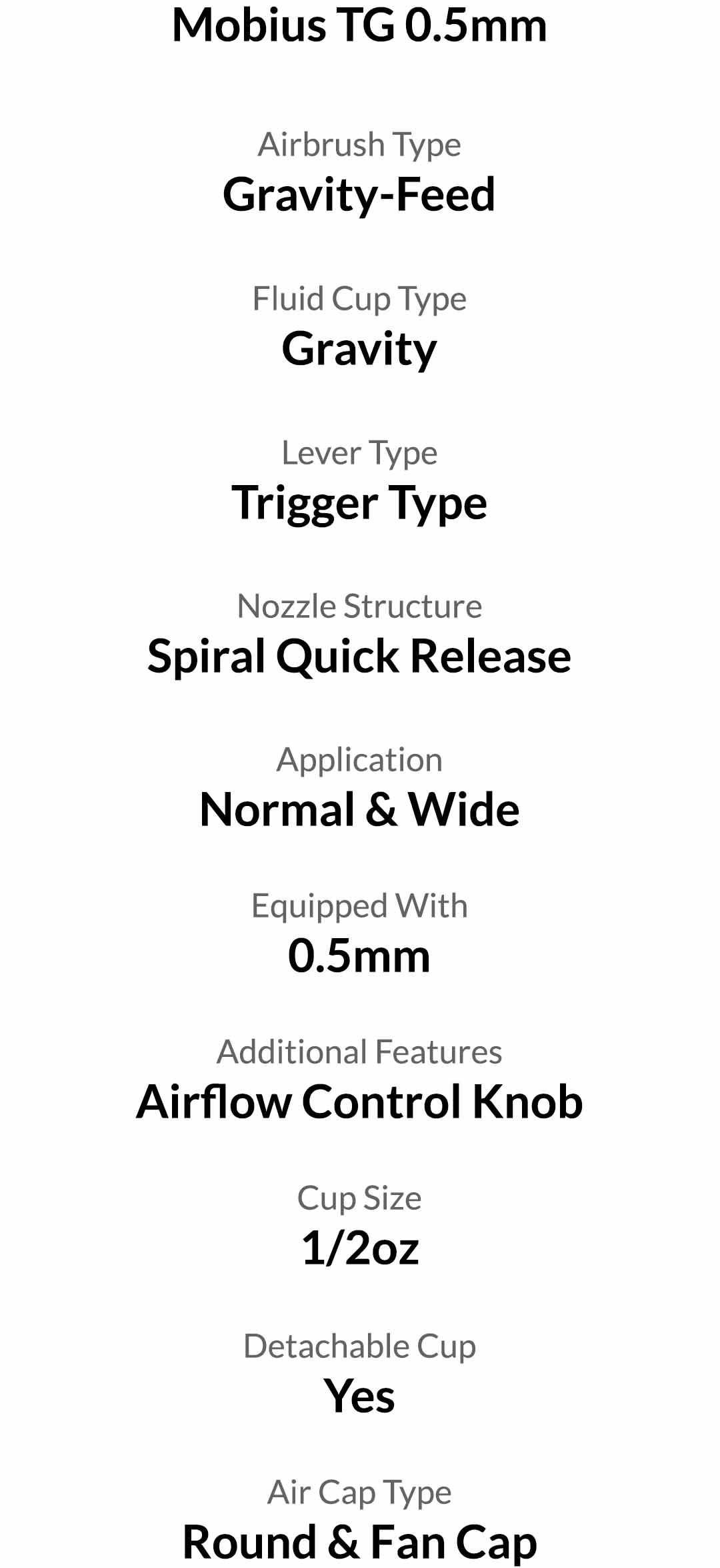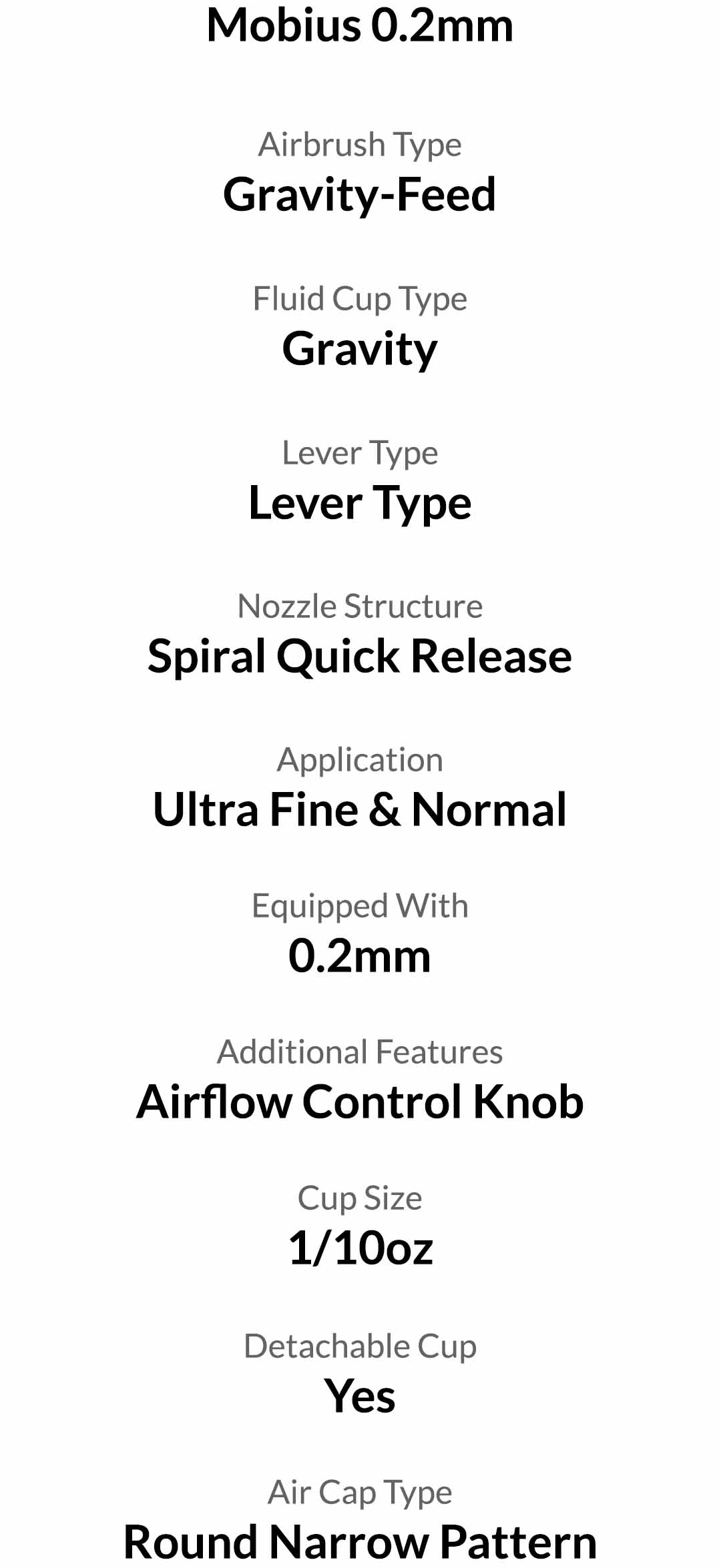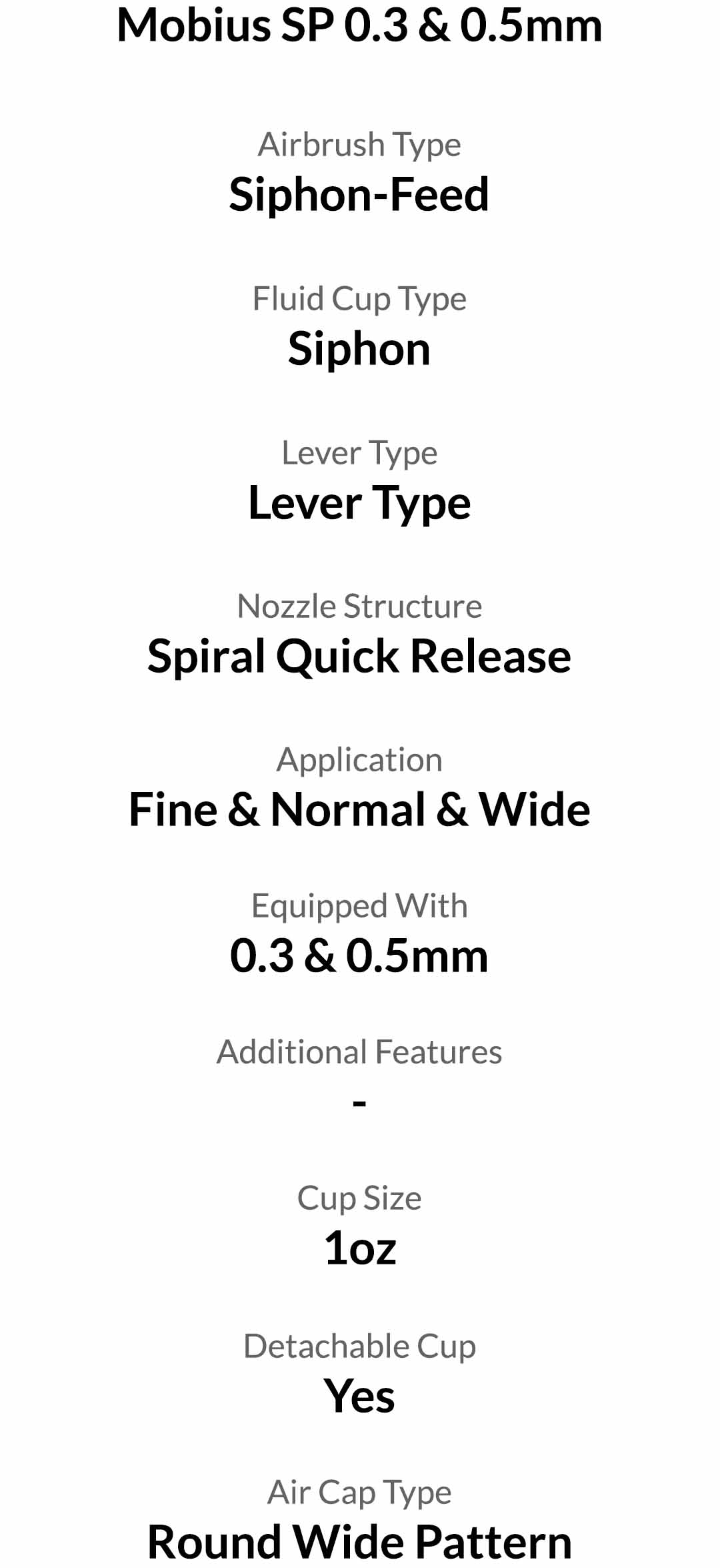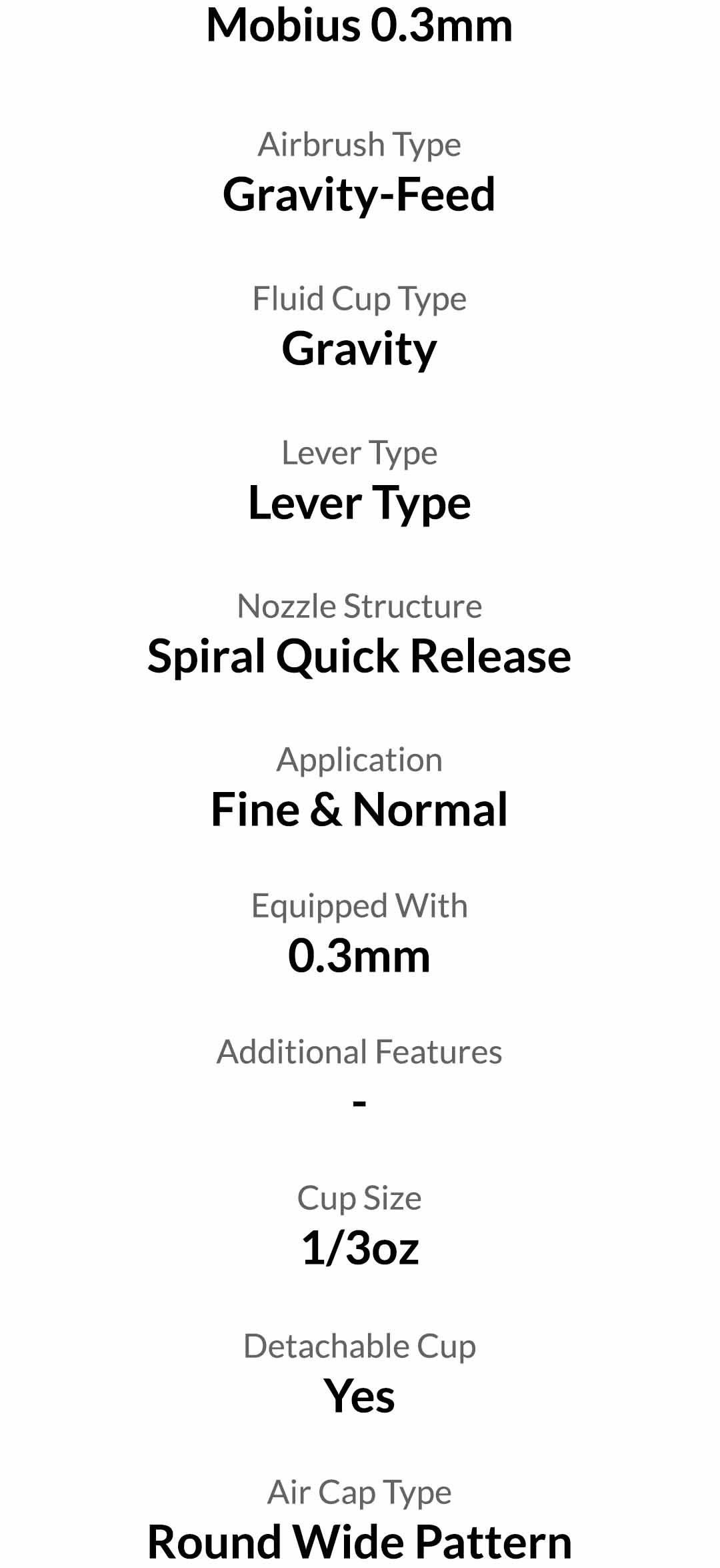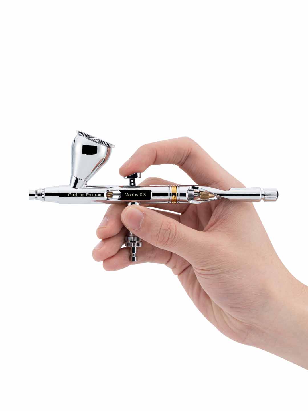 The Mobius 0.3 balances precision and versatility, making it ideal for detailed work, smooth gradients, and general spraying. Its consistent atomization and effortless control ensure professional-quality results across various applications.