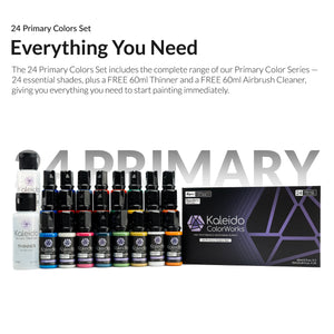 • Kaleido paints are pre-thinned water-based acrylics, ready for use straight from the bottle with 0.3–0.5mm airbrushes.