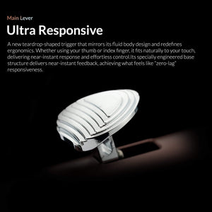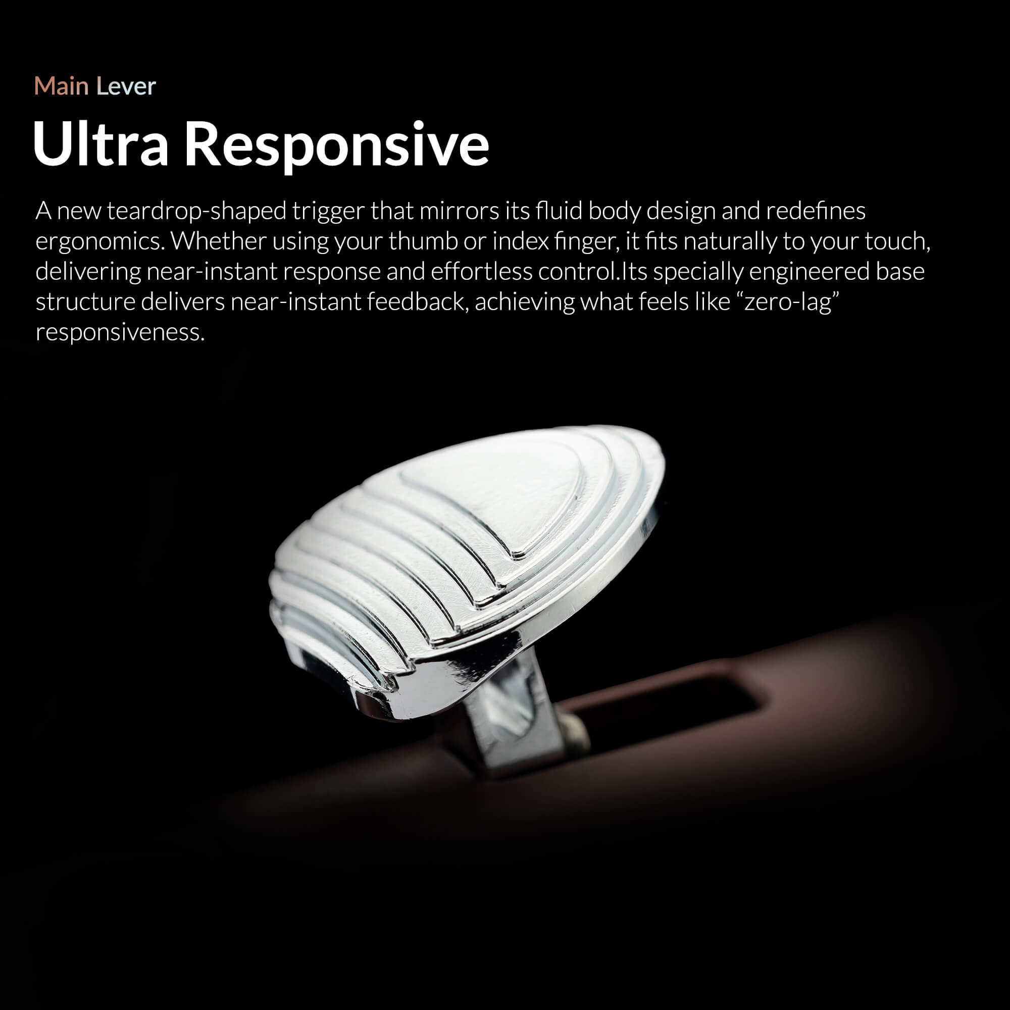 A new teardrop-shaped trigger that mirrors its fluid body design and redefines ergonomics. Whether using your thumb or index finger, it fits naturally to your touch, delivering near-instant response and effortless control.