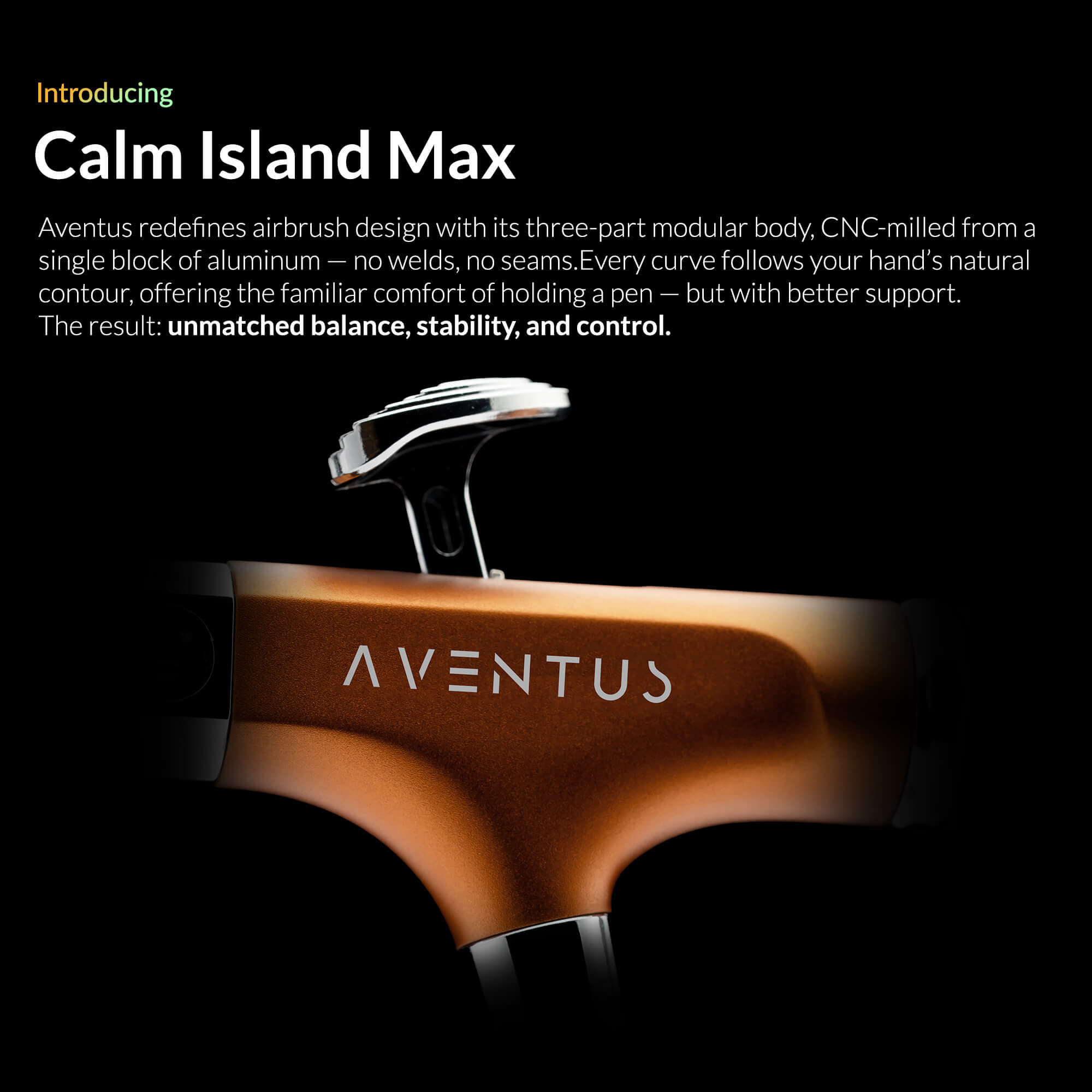 Aventus redefines airbrush design with its three-part modular body, CNC-milled from a single block of aluminum — no welds, no seams.