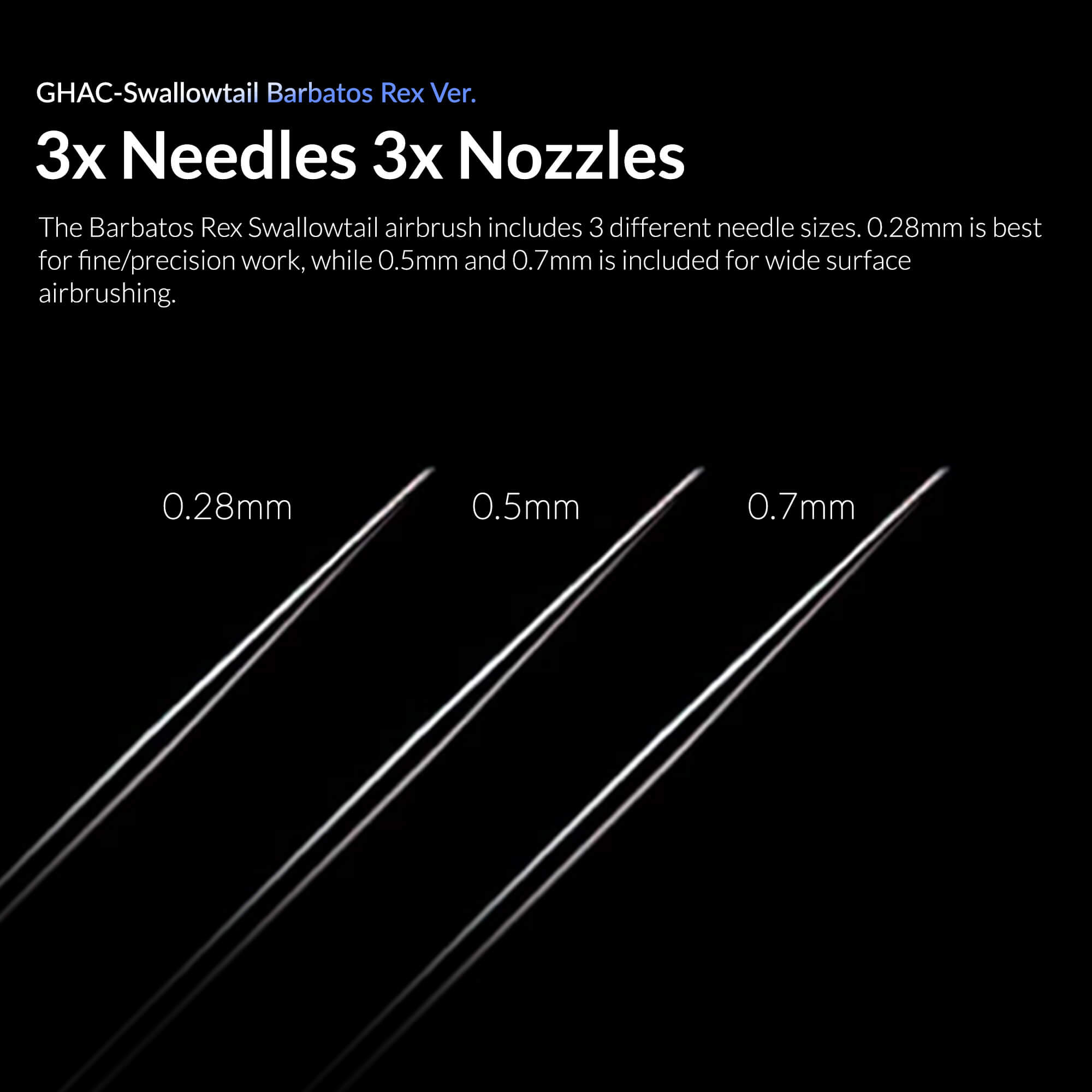 3x Needle Sizes: The Barbatos Rex Swallowtail airbrush includes three needle sizes for a variety of applications. The 0.28mm needle is perfect for fine, precision work, while the 0.5mm and 0.7mm needles are ideal for covering larger surface areas.